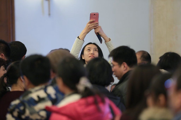 Chinese mainland journalists and reporters line up to pick up press cards for the third session of the 12th National People's Congress (NPC) and the third session of the 12th Chinese People's Political Consultative Conference (CPPCC) on March 1, 2015. More than 3,100 journalists will participate in reporting the two sessions. (Photo/ gmw.cn)