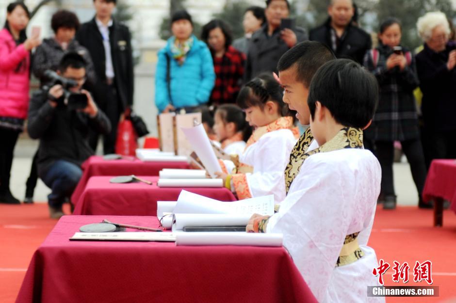 On March 1, 2015, 50 schoolchildren are dressed in China’s Han costume for their “First Writing Ceremony” by a lake in Xi’an, Shaanxi province. The First Writing Ceremony, also called Qi Meng (literally Enlightenment) Ceremony, is a very important traditional ceremony for every student before they were admitted to school. (Photo/ Zhang Yuan)