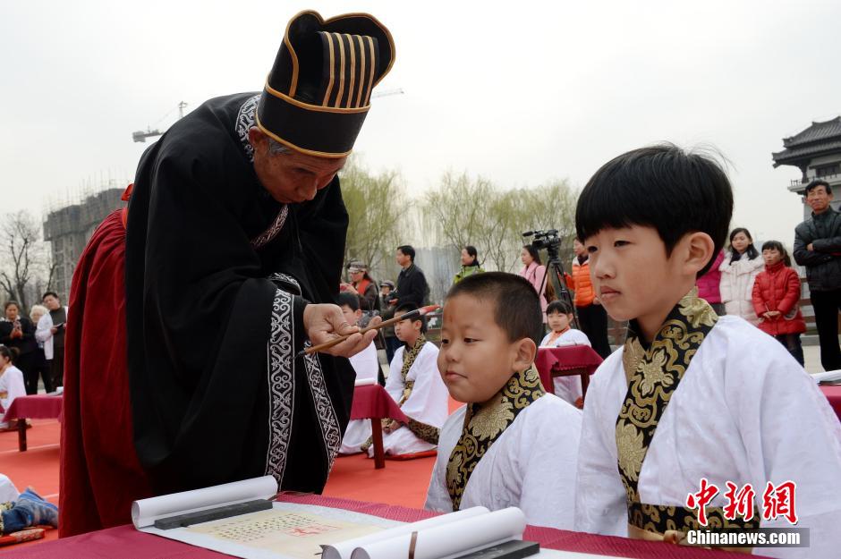 On March 1, 2015, 50 schoolchildren are dressed in China’s Han costume for their “First Writing Ceremony” by a lake in Xi’an, Shaanxi province. The First Writing Ceremony, also called Qi Meng (literally Enlightenment) Ceremony, is a very important traditional ceremony for every student before they were admitted to school. (Photo/ Zhang Yuan)