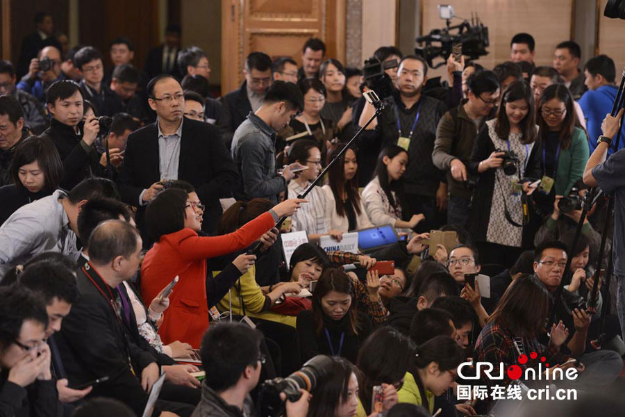 A journalist uses a selfie stick to get a better view during the press conference of the third session of the 12th Chinese People's Political Consultative Conference National Committee in Beijing on March 2, 2015. [Photo: gb.cri.cn]
