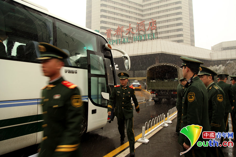 Soldiers with Beijing armed police corps prepare for the upcoming Two Sessions at the Media Center Hotel in Beijing on Feb. 27, 2015. Parts of the hotel's standard rooms have been converted to accommodate the soldiers. (Youth.cn/Kui Gongchen)