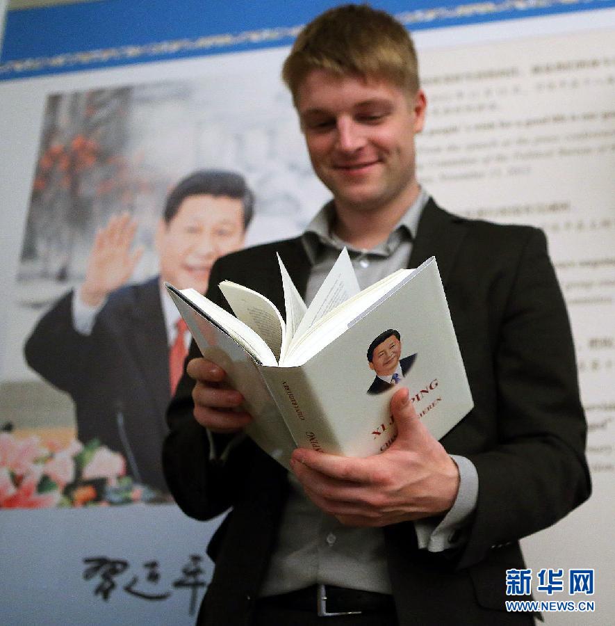 At Frankfurt Book Fair in Germany, a man reads the book "Xi Jinping: The Governance of China" on Oct. 8, 2014. (Xinhua/Luo Huanhuan)