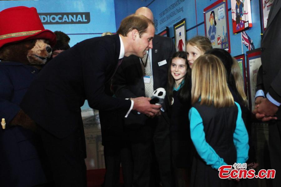 | Britain's Prince William (L) receives a gift from a girl during the China premiere of the film "Paddington" at Shanghai Film Museum in Shanghai, March 3, 2015.(Photo: China News Service/ Zhang Hengwei) |
