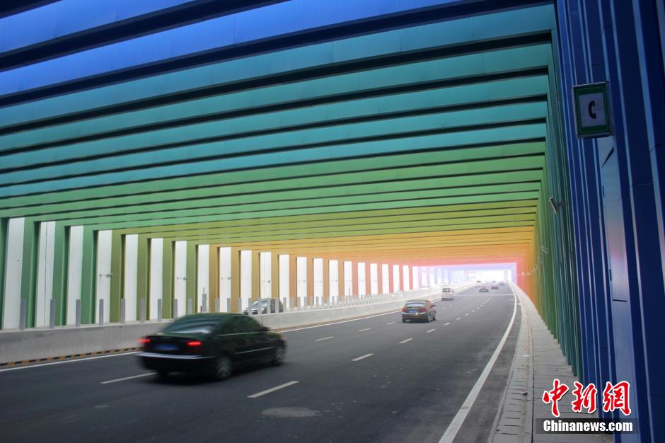 A 400-meter-long tunnel, the first of its kind in China, opens to traffic on March 1, 2015. From both ends to the middle section, the color changes from purple to blue to help drivers get used to the light change as they enter and exit the tunnel. (CNS/Ma Yiheng)