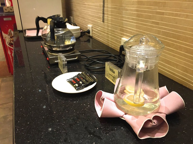 No alcohol is served this year at the restaurant for NPC deputies and CPPCC members. Only water, water with sliced lemon and apple juice are served. (Photo/Jiang Xin)