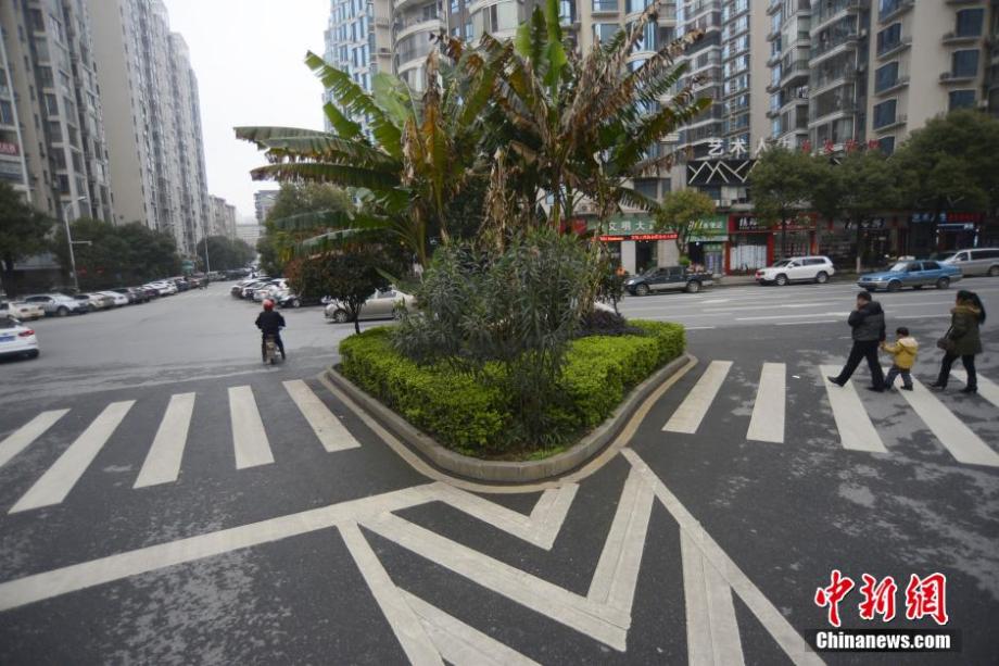 Instead of a refuge island, a parterre is built in the intersection of the three zebra crossings in the city of Chenzhou, central's China's Hunan province. Pedestrians complain that they have no place to stop after crossing the zebra crossings. (Photo/CNS)