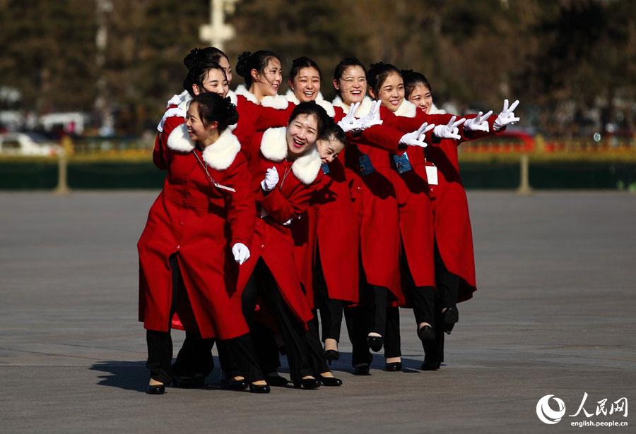 The stewards pose for photo at the Tiananmen Square in Beijing on Mar. 3 2015. Their warm smile become the beautiful landscape for the two sessions every year. (Photo/CFP)