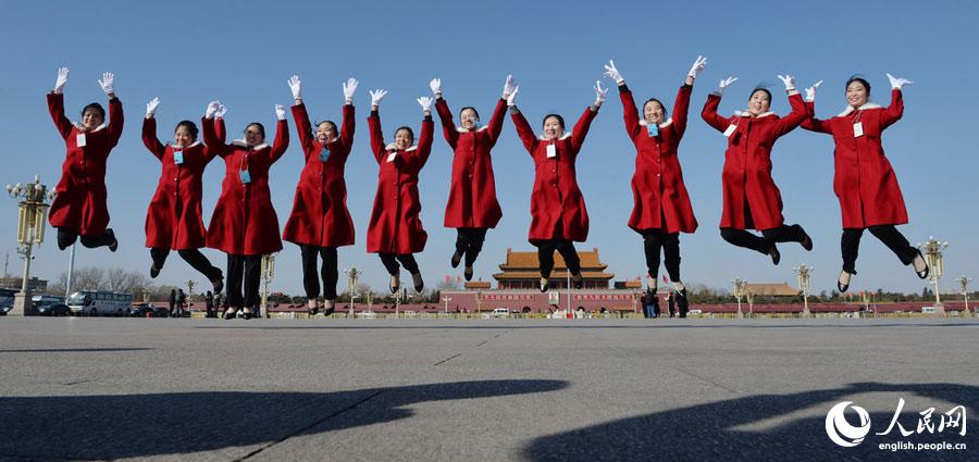 The stewards pose for photo at the Tiananmen Square in Beijing on Mar. 3 2015. Their warm smile become the beautiful landscape for the two sessions every year. (Photo/CFP)