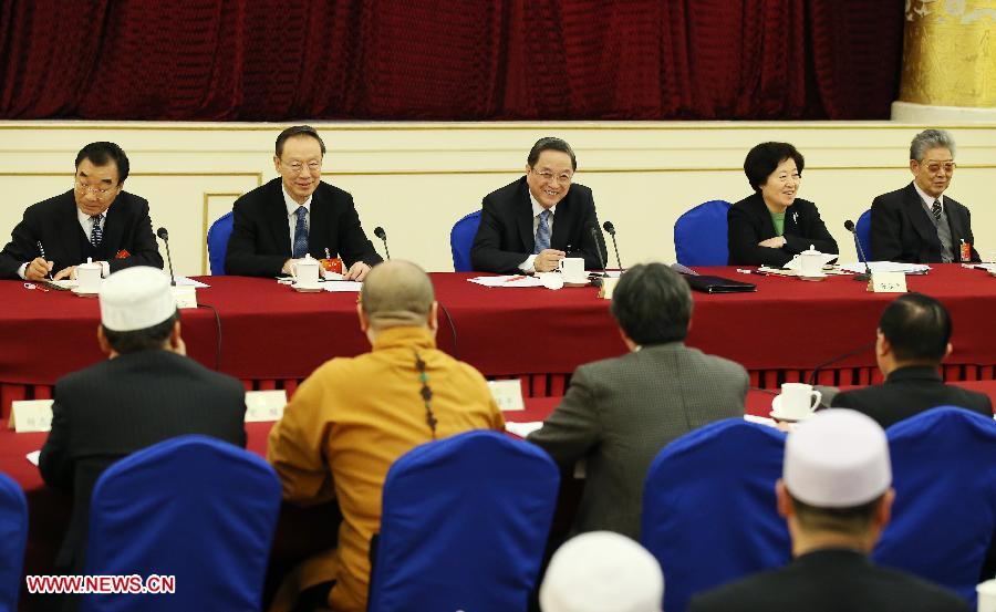 Yu Zhengsheng (back, C), chairman of the National Committee of the Chinese People's Political Consultative Conference (CPPCC) and a member of the Standing Committee of the Political Bureau of the Communist Party of China (CPC) Central Committee, visits members of the 12th National Committee of the Chinese People's Political Consultative Conference (CPPCC) from the religious sector and joins their panel discussion in Beijing, capital of China, March 4, 2015. (Xinhua/Yao Dawei)