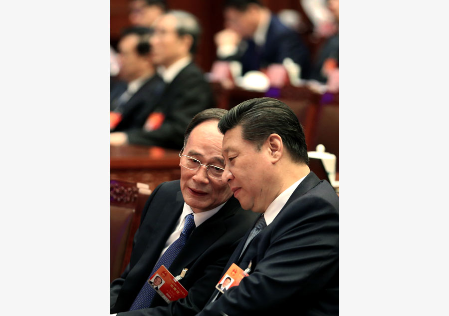 President Xi Jinping talks with Wang Qishan, head of the Central Commission for Discipline Inspection, at a preparatory meeting for the third session of the 12th National People's Congress in Beijing on Wednesday. Wu Zhiyi / China Daily