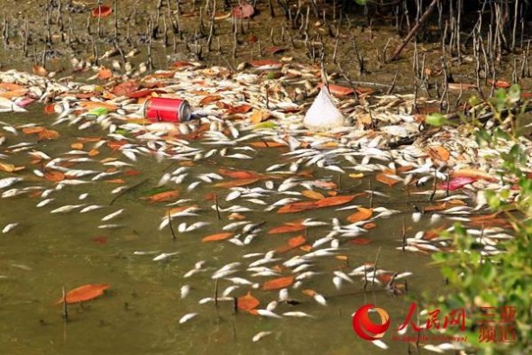 | Dead fish are seen in a river in Sanya, China's southern-most island province of Hainan. (Photo/People's Daily Online) |
