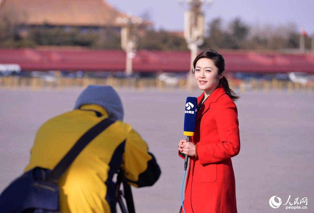 | An anchor prepares for the live report outside the Great Hall of the People on March 3, 2015. (Photo/CFP) |