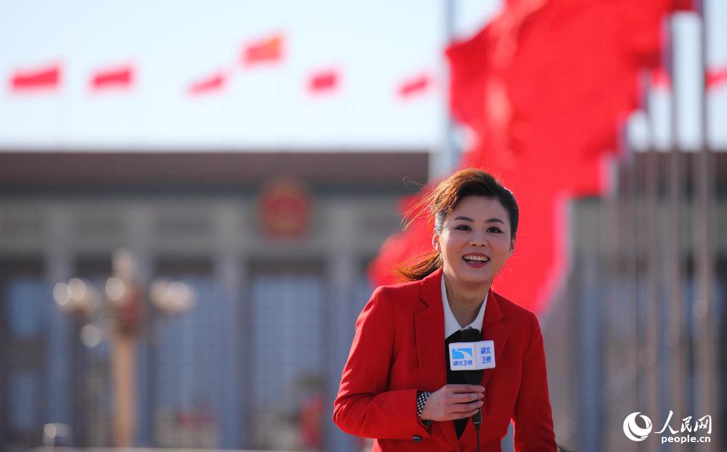 An anchor climbs up a ladder to give live report of the CPPCC opening ceremony on March 3, 2015. Female journalists make up majority of reporters covering this year's "two sessions", China's most important annual political events. (Photo/CFP)