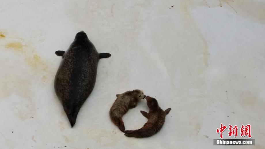 A female harbor seal gave birth to twins in an aquarium in Dalian on March 4, 2014. According to documents, this is the world's first case of harbor seal twins born in an artificial breeding environment. (CNS/Yang Yi)