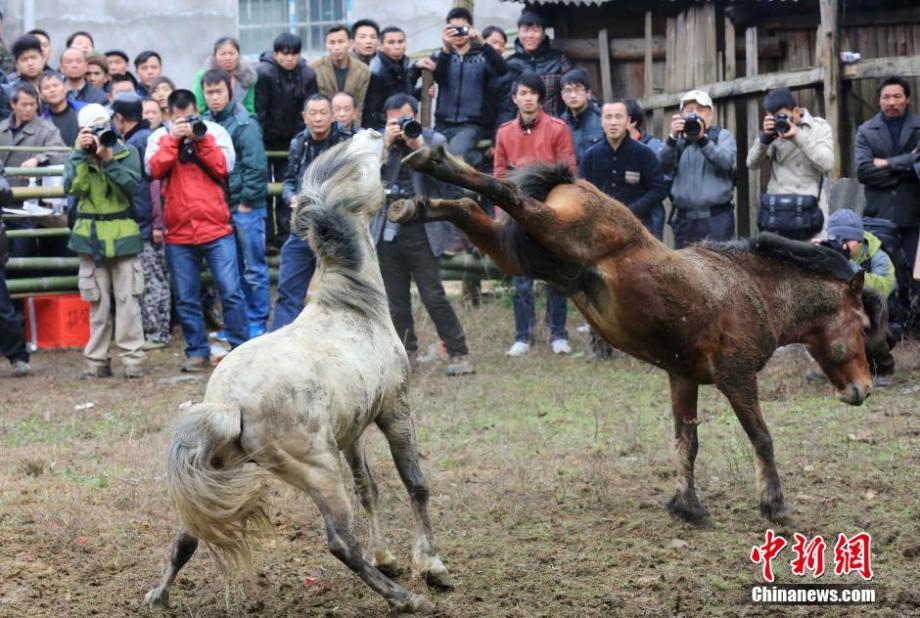 A horse fighting competition is held to celebrate the upcoming Lantern Festival in Rongshui Miao Autonomous County in southwest China's Guangxi on March 3, 2015. The horse fighting competition has a history of 500 years. It was originally set for ruling marriage dispute, and later became an entertainment for local people. (Photo/CNS)
