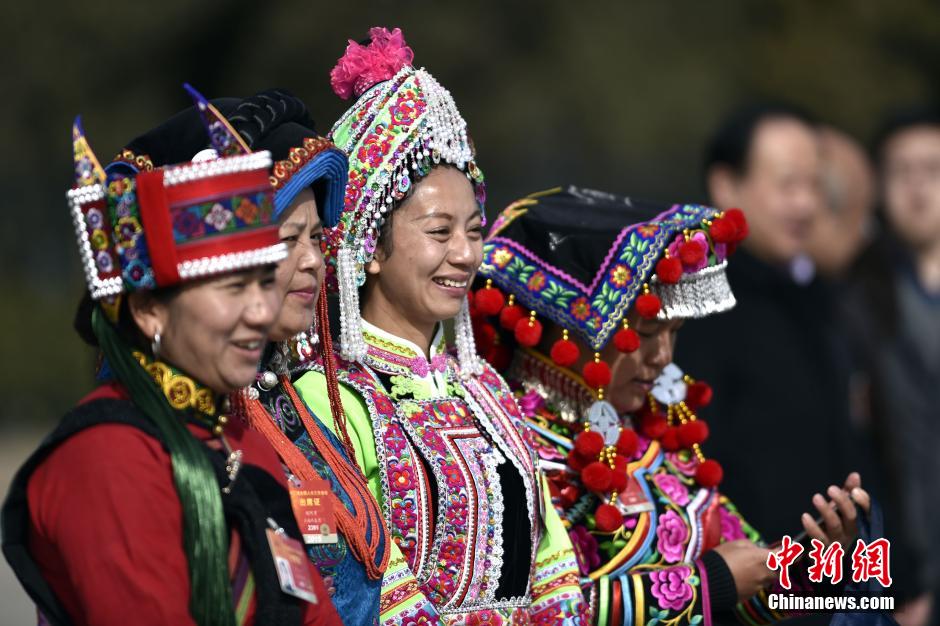 NPC deputies from ethnic minority groups wear costumes unique to their ethnicity to attend the preparatory meeting for the third session of the 12th NPC. (CNS/Jin Shuo)