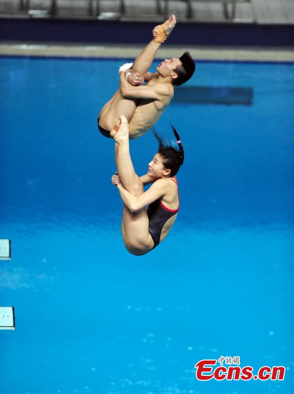 He Zi and Chen Aisen compete in the mixed synchronized 3m springboard final during the China Diving Championships in Wuhan, Central China’s Hubei province, March 6, 2015. The group wins the first place. The mixed synchronized events make their debut in the national championships. (Photo: China News Service/Zhang Chang)