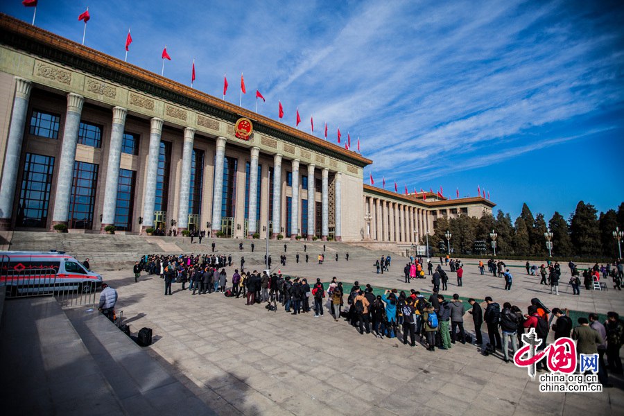 Journalists wait in the line to enter the Great Hall of the People on March 4, 2015. (China.org/Zhengliang)