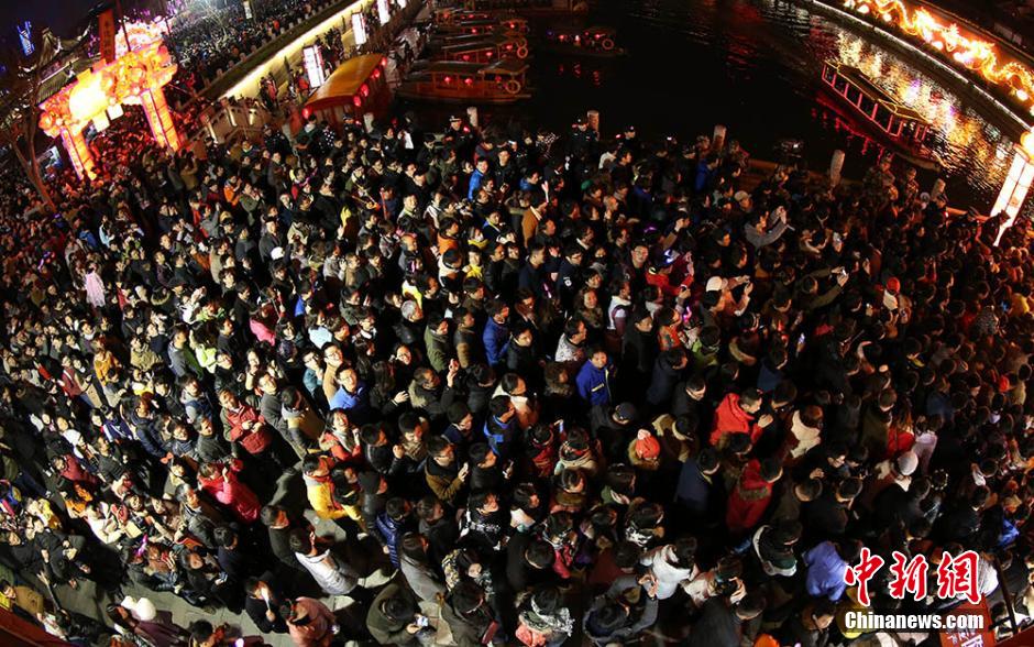 According to information released by the local police, a total of 520,000 people visited the Qinhuai Lantern Fair on the night of Lantern Festival in Nanjing, capital of east China's Jiangsu province on March 5, 2015. Qinhuai Lantern Fair is a popular folk cultural activity in Nanjing, mainly held during the period from the Spring Festival to the Lantern Festival (CNS/Yang Bo)
