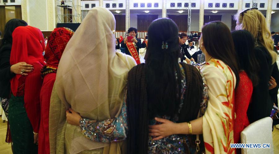 Guests pose for a group photo during a reception celebrating the International Women's Day in Beijing, capital of China, March 6, 2015. The All-China Women's Federation held a gathering attended by female domestic workers and foreign diplomats in Beijing on Friday ahead of International Women's Day. (Xinhua/Yin Gang)