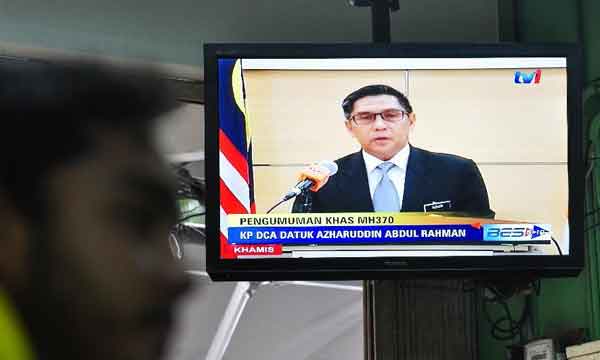 | A televison program shows Director General of the Malaysian Department of Civil Aviation Azharuddin Abdul Rahman announcing a statement, in Kuala Lumpur, Malaysia, on Jan. 29, 2015. Azharuddin Abdul Rahman said on Thursday that the Malaysian government officially declared MH370 an accident, and all 239 people on board the plane were presumed dead. (Xinhua/Chong Voon Chung) |