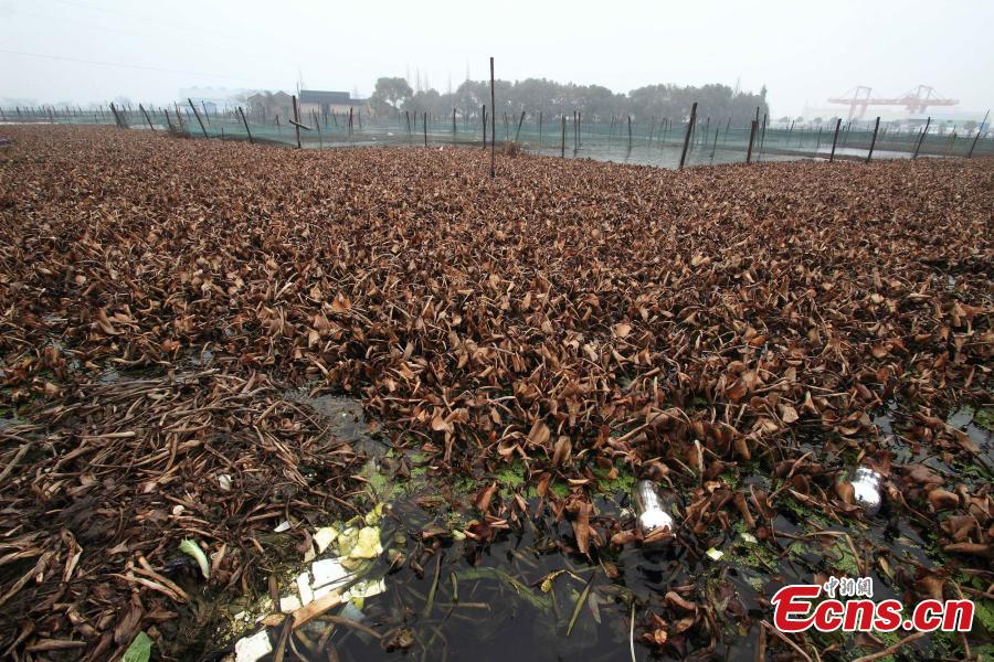 | Water hyacinth is seen covering the Hangyong Canal in Shaoxing, East China’s Zhejiang province on March 8, 2015. The water plant clogs waterways in many places of China in recent years, choking fish and causing hardship for local fish farmers. (Photo: China News Service/ Li Ruichang) |
