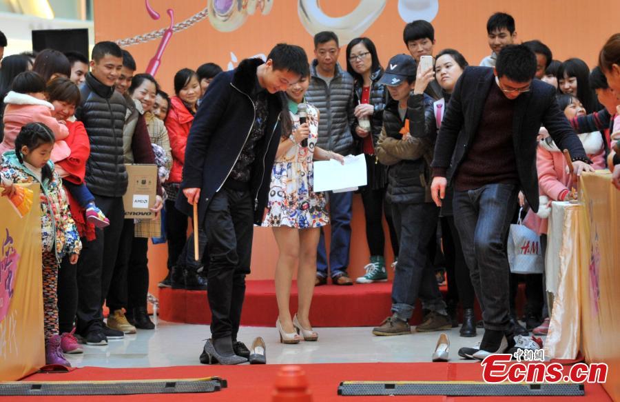| Men put on women's high heels to compete in an obstacle race at a shopping mall in Fuzhou, East China’s Fujian province, March 8, 2015. International Women's Day on March 8 dates back to the beginning of the 20th Century and has been observed by the United Nations since 1975. The UN writes that it is an occasion to commemorate achievements in women's rights and to call for further change. (Photo: China News Service/Lv Ming) |