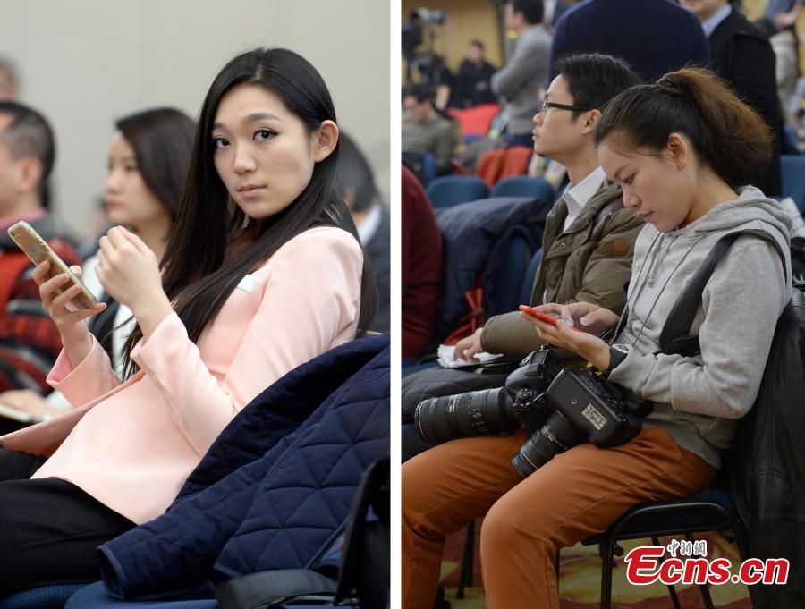 A combo shows female reporters at a press conference of the Third Session of the 12th National People's Congress in Beijing, March 8, 2015. International Women’s Day is annually held on March 8 to celebrate women’s achievements throughout history and across nations. (Photo: China News Service/Hou Yu)