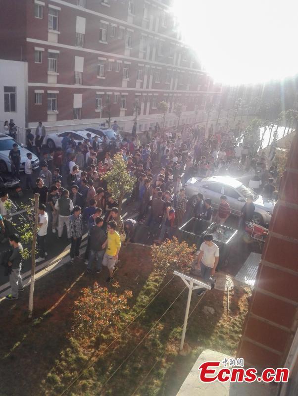 A picture taken by cell phone shows university students gather on the campus after an earthquake in Songming county, Southwest China's Yunnan province, March 9, 2015. A 4.6-magnitude earthquake jolted the county on Monday, with the epicenter located about 50 km from Kunming, capital city of the province. (Photo: China News Service/Zhe Yanyu)