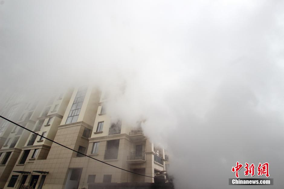 A malfunction in a steam pipe in Shaoxing, Zhejiang province leaves high-rise buildings around in "floating clouds" on March 9, 2015. (Photo/CNS)