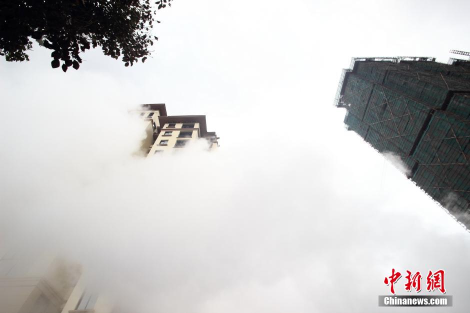 A malfunction in a steam pipe in Shaoxing, Zhejiang province leaves high-rise buildings around in "floating clouds" on March 9, 2015. (Photo/CNS)