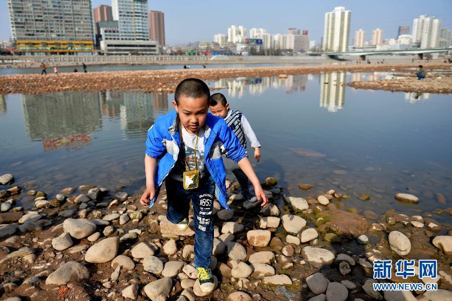 Children play with pebbles on the riverbed of the Yellow River in Lanzhou city, northwest China’s Gansu province on March 8, 2015. The riverbed of the Yellow River was exposed due to decrease in water supply from upstream which usually occurs in February and March, giving rise to collection of unique stones, a tradition that has a history of several hundred years. (Xinhua/Chen Bin)