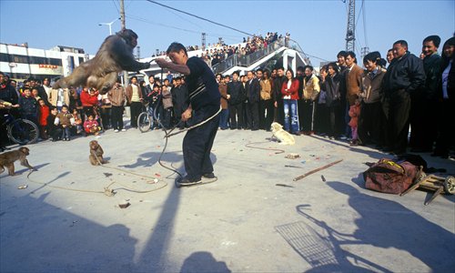 | Several monkeys perform an acrobatic show. (Photo: Ma Hongjie) |