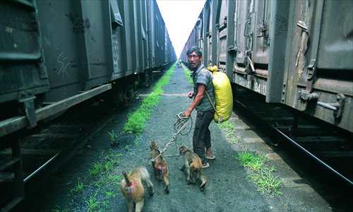 | A decade ago, a busker and his monkeys sneak onto trains to avoid paying for tickets. (Photo: Ma Hongjie) |