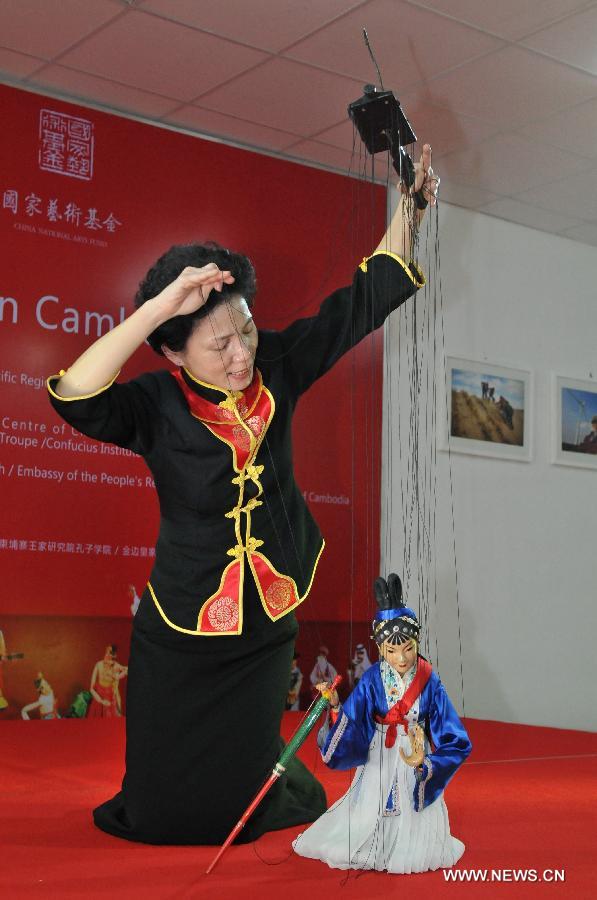 A puppeteer pulls strings on a stage in Phnom Penh, Cambodia, March 11, 2015. An eight-member troupe of China's Fujian puppetry practitioners performed traditional puppetry here on Wednesday to promote cultural ties between the two countries. (Xinhua/Li Hong)