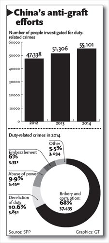 The work report of the SPC showed that Chinese courts in 2014 convicted and punished 44,000 criminals in 31,000 cases of embezzlement and bribery, including severe cases such as Liu Tienan, former deputy head of the National Development and Reform Commission, and Li Daqiu, a former senior political advisor in Guangxi Zhuang Autonomous Region.