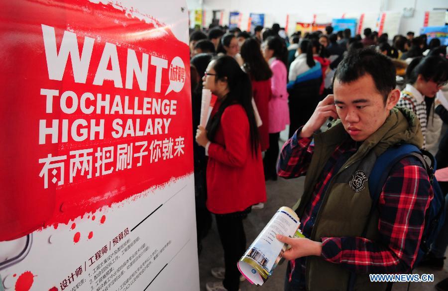 A job seeker looks through employment information at a job fair held for fresh graduates in Liaocheng City, east China's Shandong Province, March 14, 2015. Over 10,000 opportunities were offered at the fair. (Xinhua/Zhang Zhenxiang)