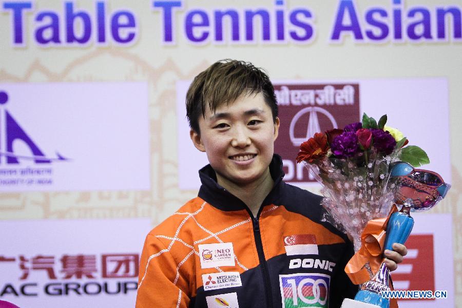 Feng Tianwei of Singapore attends the award ceremony after her women's singles final match against Liu Shiwen of China at the 28th Table Tennis Asian Cup in Jaipur, India, March 15, 2015. Feng Tianwei won 4-3 to claim the title. (Xinhua/Zheng Huansong)