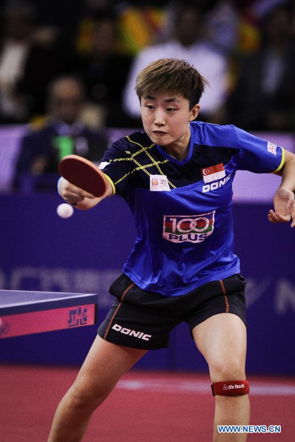 | Feng Tianwei of Singapore returns a ball during her women's singles final match against Liu Shiwen of China at the 28th Table Tennis Asian Cup in Jaipur, India, March 15, 2015. Feng Tianwei won 4-3 to claim the title. (Xinhua/Zheng Huansong) |