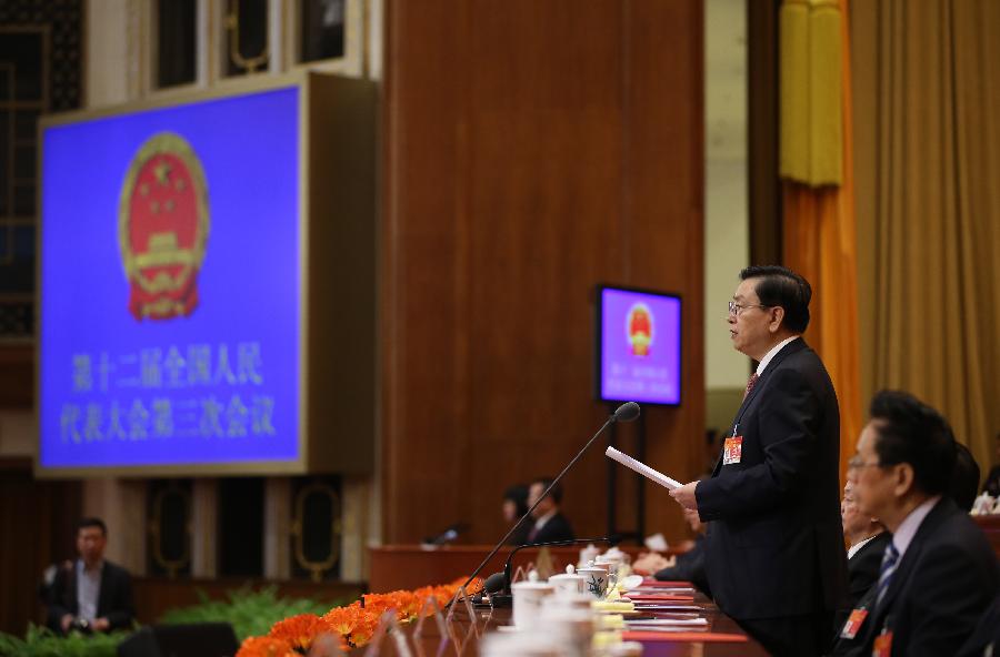 Zhang Dejiang, chairman of the Standing Committee of China's National People's Congress (NPC), presides over the closing meeting of the third session of the 12th NPC at the Great Hall of the People in Beijing, capital of China, March 15, 2015. (Xinhua/Lan Honggguang)