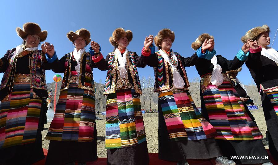 Farmers take part in a spring ploughing ceremony in Zetang Coungy of Shannan Prefecture, southwest China's Tibet Autonomous Region, March 16, 2015. Local farmers celebrated the traditional spring ploughing ceremony on March 16, the first day of spring ploughing in the lunar Tibetan calendar. The grain output of Tibet has witnessed a growth for five year in a row from 900,000 metric tons (tonnes) in 2009 to 985,000 tonnes in 2014. (Xinhua/Chogo)