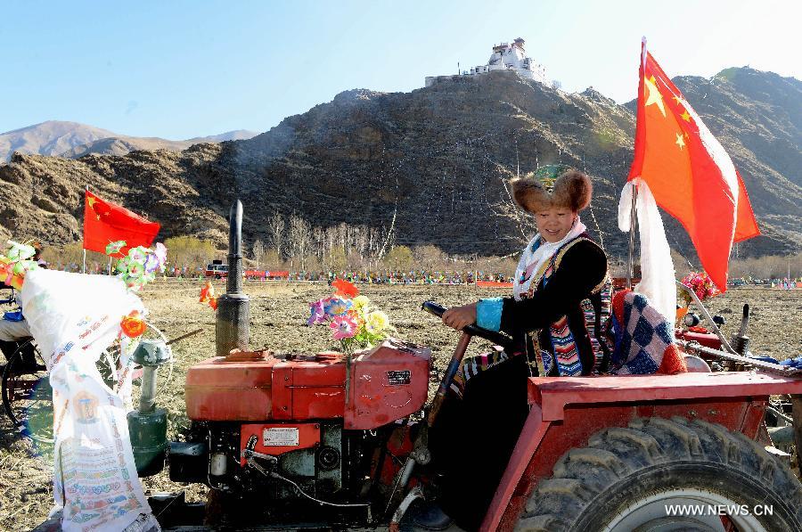 Female tractor driver Qoizong takes part in a spring ploughing ceremony in Zetang Coungy of Shannan Prefecture, southwest China's Tibet Autonomous Region, March 16, 2015. Local farmers celebrated the traditional spring ploughing ceremony on March 16, the first day of spring ploughing in the lunar Tibetan calendar. The grain output of Tibet has witnessed a growth for five year in a row from 900,000 metric tons (tonnes) in 2009 to 985,000 tonnes in 2014. (Xinhua/Chogo)