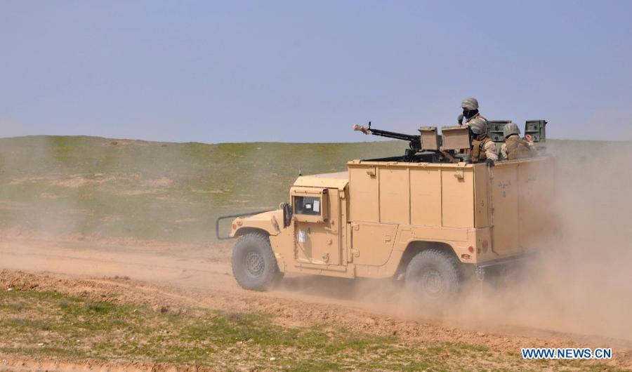 | Afghan policemen patrol in Khush Tepa district of Jawzjan province in northern Afghanistan, March 16, 2015. (Xinhua/Arui) |