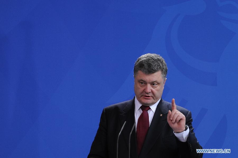 Ukrainian President Petro Poroshenko attends a press conference with German Chancellor Angela Merkel (not in picture) in Berlin, Germany, March 16, 2015. Merkel on Monday promised Ukraine further assistance to achieve a peaceful solution in eastern regions of the country during a meeting with Ukrainian President Petro Poroshenko. (Xinhua/Shang Jing)