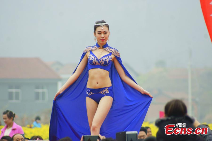 Models walk the runway in a countryside fashion show during the second Rapeseed Festival in Yuan’an county, Yichang city, Central China’s Hubei province, March 14, 2015. The blooming flowers make Yuan’an county a destination for tourists to go for a spring outing. (Photo: China News Service/Zhou Jianping)
