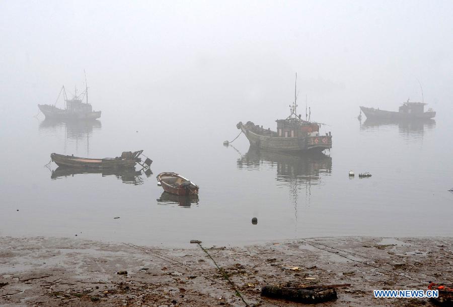 A fishing boat looms out of heavy fog along the seaside of Lianyungang City, east China's Jiangsu province, March 17, 2015. Heavy fog hit many areas of east China's Jiangsu province on Tuesday. (Xinhua/Wang Chun)