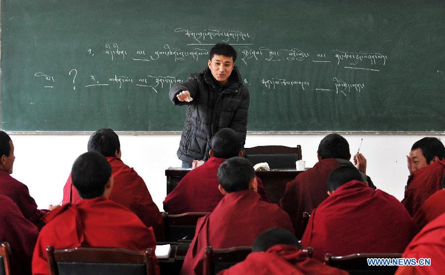 File photo taken on March 16, 2012 shows teacher Benba Zhaxi giving a lecture of Tibetan language at the Yunnan Institute of Buddhist Studies Diqing Branch in Shangri-la County, southwest China's Yunnan Province. Located at an altitude of 3,300 meters, Yunnan Institute of Buddhist Studies Diqing Branch is an important school of Tibetan Buddhism in Yunnan. Established in 2005, the institute now has a total of 68 monks, who are from some monasteries in Yunnan, Sichuan and Tibet. Besides daily chanting sutras, monks here also take classes such as Tibetan language, Chinese, Buddhist Theory, Politics, English and Computer. (Xinhua/Lin Yiguang)