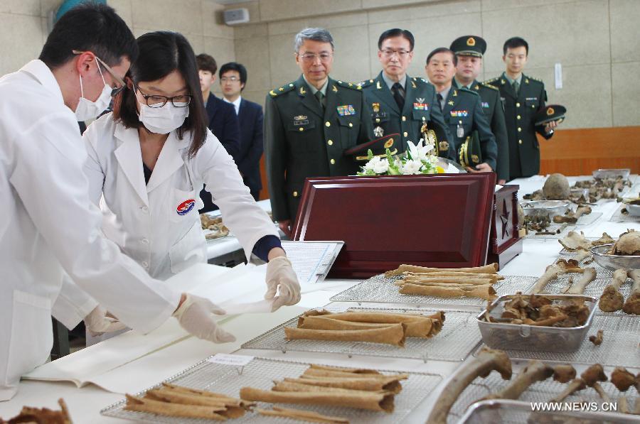South Korean workers prepare the remains of Chinese soldiers who died in the Korean War, in Paju, South Korea, March 16, 2015. The remains of 68 Chinese soldiers will be flown back to China after a handover ceremony at Incheon Airport on March 20.(Xinhua/Yao Qilin)