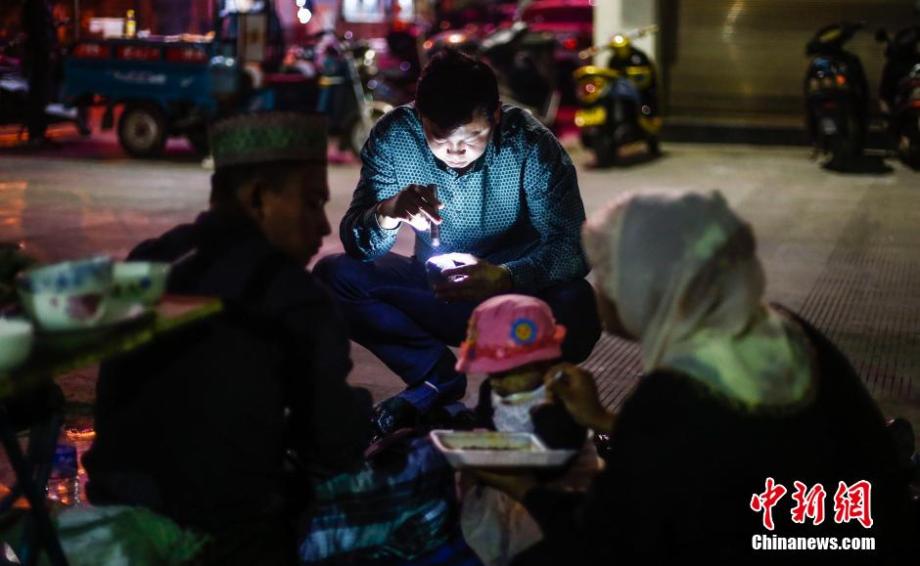 A gem merchant feeds her child in the Delong jewelry night market in Ruili on Mar. 9. (CNS/Zhang Hao)