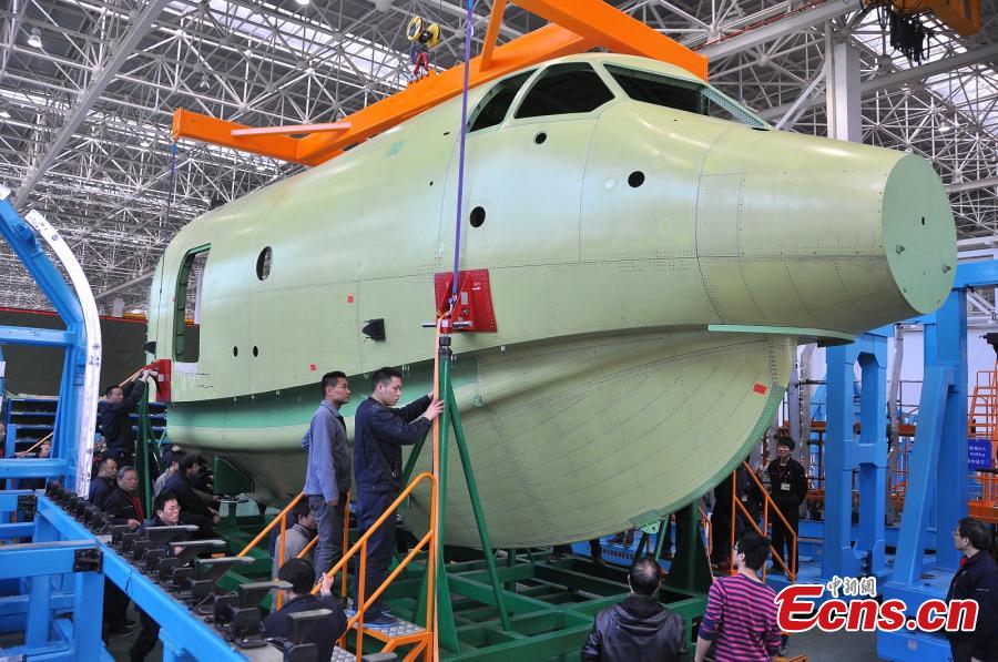 | The nose section of China's large amphibious aircraft AG600 has completed assembly and is ready to deliver, the AVIC General Aircraft Company announced on March 17, 2015. The 9.5-meter-long section consists of 5,200 components. The AG600, intended to be the world's largest amphibious aircraft, has a takeoff weight of 53.5 tons. It can collect 12 tons of water in 20 seconds and could be used to fight forest fires and in marine rescue. (Photo/Dai Haibin) |